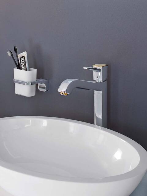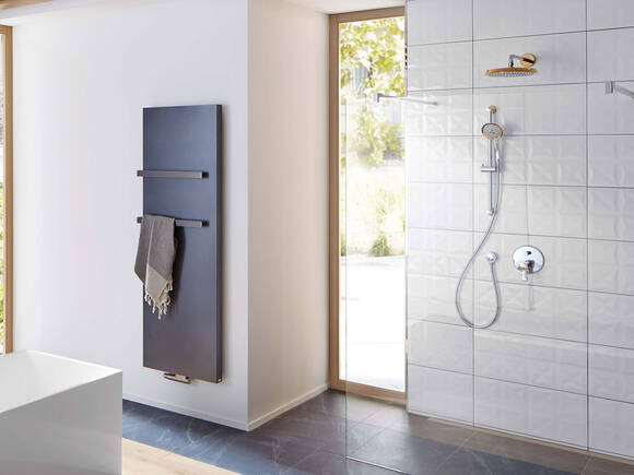 The floor-level shower provides freedom of movement and underlines the spacious interior. As eye-catchers in the room, the overhead and hand showers in the Raindance Classic line combine traditional bathroom design with functional precision. With the gentle curve of their elegant forms, the faucets of the hansgrohe line Metropol Classic set contrasting highlights in the modern bathroom.